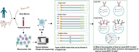 B淋巴细胞由Max D.Cooper等1965年发现和命名(Nature. 1965 Jan 9:205:143-6),在适应性免疫应答中发挥着核心作用。B细胞在维持自身耐受的同时,能够介导机体对多种多样的抗原产生特异性的应答并保持免疫记忆,其机制源于“一个淋巴细胞只表达一种受体”的克隆选择学说(Burnet,1959)和胚系“V-D-J等位基因排斥重组”而形成的庞大的CDR3组库(Tonegawa S,1976,PNAS. 1976;73(10):3628-32)。然而,早在1961年,Makela等人发现从免疫大鼠淋巴结中分离的单个细胞能同时产生抗H抗体和抗O抗体(J Immunol. 1961 Oct;87:457-63);1985年,Feddersen等人证实单个浆细胞的两条κ链等位基因同时经历了重排(等位基因包容重组,PNAS. 1985 Jul;82(14):4793-7)。之后,双受体B淋巴细胞一直有着细胞水平和特殊动物模型实验证据的支撑,但基于研究技术的限制,从大规模的B细胞水平,分析双BCR B细胞的比例和来源机制尚未得到阐明。