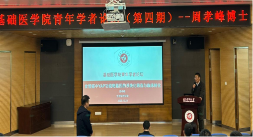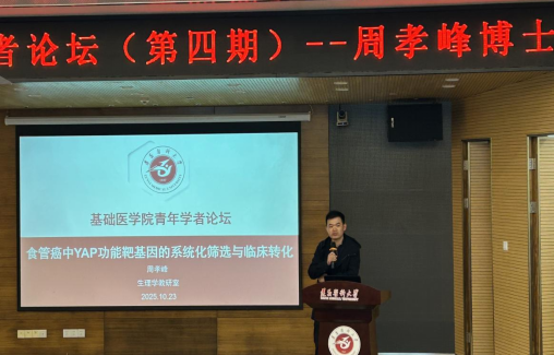 2025年10月23日,太阳集团122cc成功举办了第四期青年学者论坛。本次论坛由生理学教研室青年博士周孝峰主讲,主题为“食管癌中YAP功能靶基因的系统化筛选与临床转化”。太阳集团122cc副经理韩勇、生命科学研究院副经理保玉心出席了此次论坛,生理学教研室主任孔德营副教授担任主持,公司全体博士参加了本次讲座。